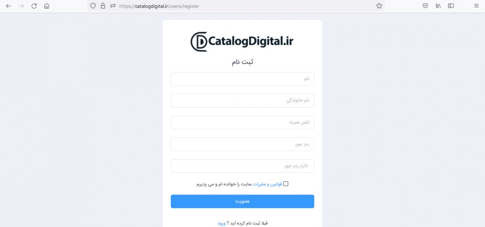 یا به صورت مستقیم روی این لینک کلیک کنید https://catalogdigital.ir/users/register تا وارد قسمت ثبت نام شوید