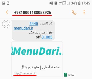 دقت داشته باشید که کد ارسالی به گوشی شما طبق نمونه عکس زیر از سایت منو داری https://menudari.ir برای شما ارسال می شود (به شماره و لینک سایت دقت کنید)